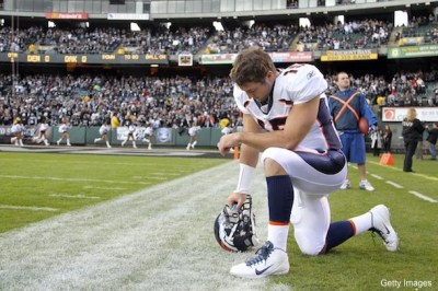 For those who may not know, Tim Tebow is the quarterback of the Denver Broncos.  Before, he was the starting quarterback for the University of Florida and was the first sophomore to ever win the Heisman Trophy (the MVP award for college football).  In recent weeks Tim Tebow has led his team to countless victories against innumerable odds while making sure to “Tebow” after every achievement.