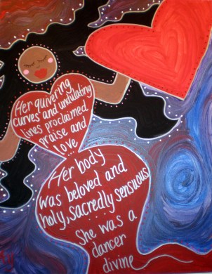 This dancing history combined with feminist and queer understandings of the Song of Songs in a way that enlightened my approach to painting the Shulamite as a Holy Woman Icon. Calling the Shulamite holy is my way of affirming female sexuality, the beautiful variety of the body’s shapes and sizes, and including the LGBT community in the canon of saints. Accordingly, the Shulamite’s robust curves fill the canvas as we remember her dancing body: