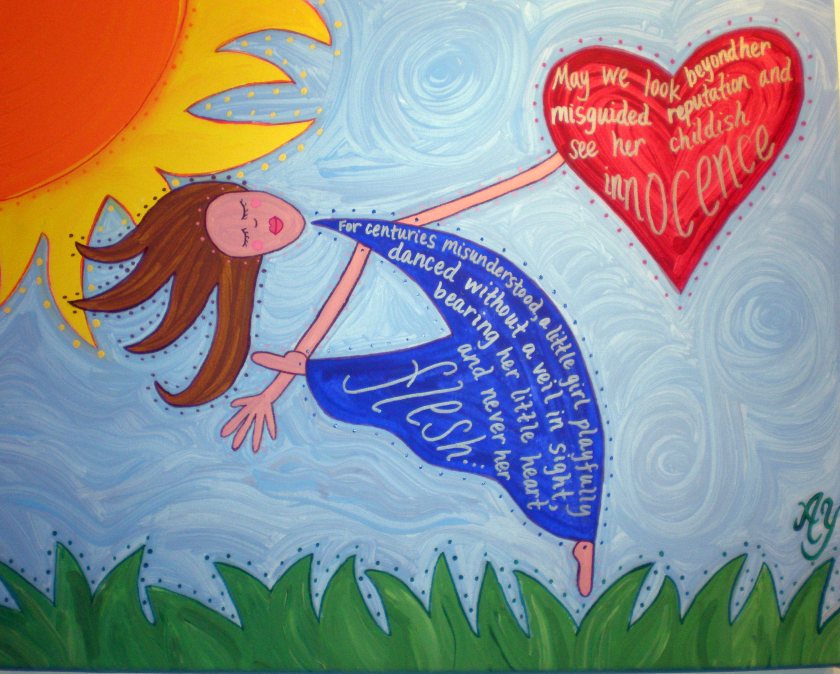 Each month I focus my article on one of my Holy Women Icons with a folk feminist twist. Virginia Woolf , the Shulamite, Mary Daly, Baby Suggs, Pachamama and Gaia, and Frida Kahlo have reputations that match their lived realities relatively closely, so my paintings have attempted to reflect these realities. The subject of this month’s article, however, has been misrepresented and misunderstood throughout the ages. Her “name” is Salome and we read of her dancing story in the Gospels of Matthew and Mark.