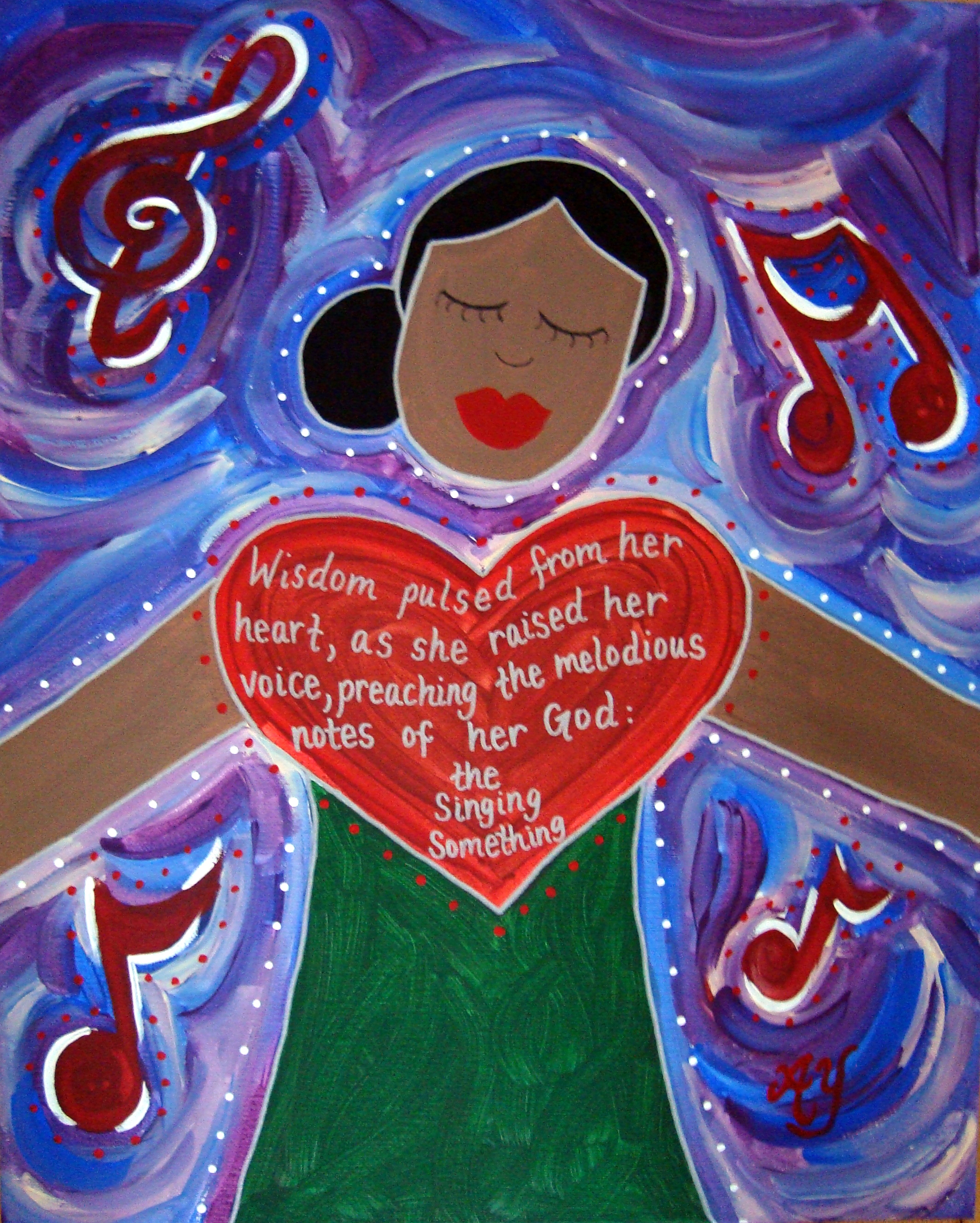 So, with musical notes swirling about her, Anna Julia Cooper stands strong, centered with her arms spread so wide that they reach off the canvas, embracing and emboldening us to find the Singing Something within, as her heart cries out to us: