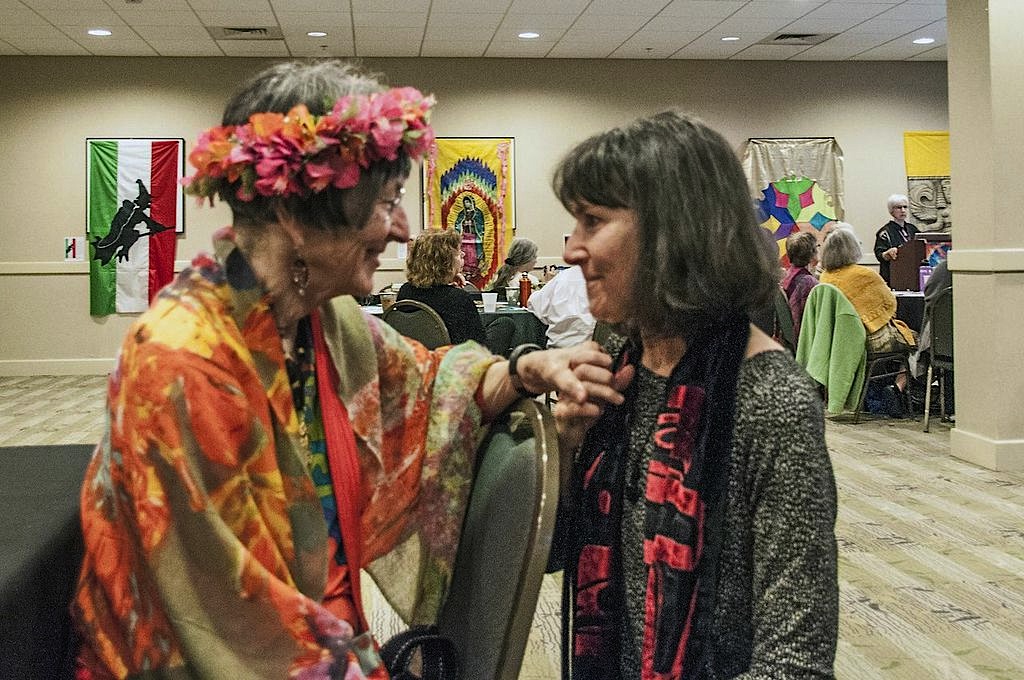 When I entered the room of the Matriarchal Studies Conference the next day, I was greeted visually by Lydia Ruyle’s banners, dozens of colorful multicultural expressions of the Divine Mother. And then, there was Lydia herself, her head encircled in a wreath of flowers. I whispered to her what had happened and she gave me a big hug, her own heart fresh from the loss of her brother last year. I looked around the room at women from so many places, and saw the altar to Our Lady of Guadalupe they had created. I knew then that I could stay. The nurturing energy was palpable. I felt the support of my siblings from afar and my Mother’s peaceful state from within. My grief of the past year, in anticipation of losing her, was transformed into something else.
