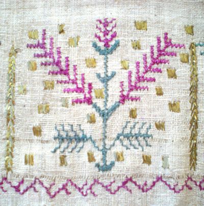 Women embroider their festive dance costumes with images of seeds, sprouts, leaves, fruits, trees, birds, animals, Goddess figures, and ‘signs of life’.[2] They also portray the zigzags, triangles, spirals, swirls, lozenges and stars which are so abundant in the archaeological record of Neolithic cultures. As Gimbutas explains,