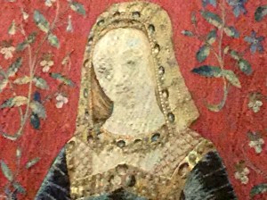 The intricate, densely packed “millefleur” (thousand flowers) background of many different plants and flowers was most likely not in the original cartoon drawings, probably created by a leading artist of the day – “the Master of Anne of Britany.” The creation of tapestries was a collaborative affair. This cycle was woven in Flanders, known for its exceptional weaving work at the time. It is thought that the weavers in Flanders, working from the cartoons, insisted on a millefleur background.