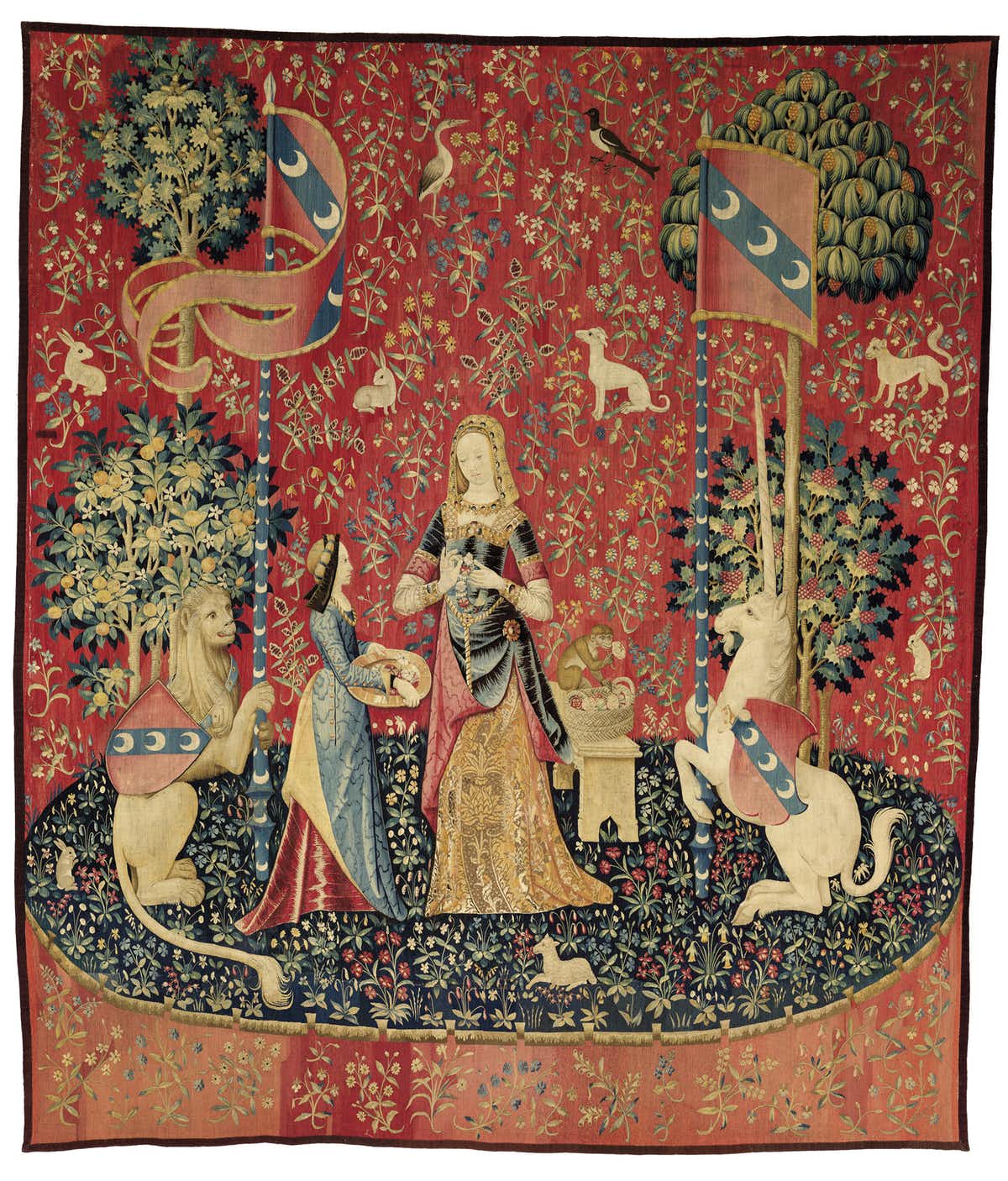 Woven with luxurious wool and silk and dyed with precious natural dyes, the tapestries are full of Christian symbolism, reflective of the era. It is generally agreed that they are an allegory of the senses – a contemplation on earthly pleasures and courtly culture.