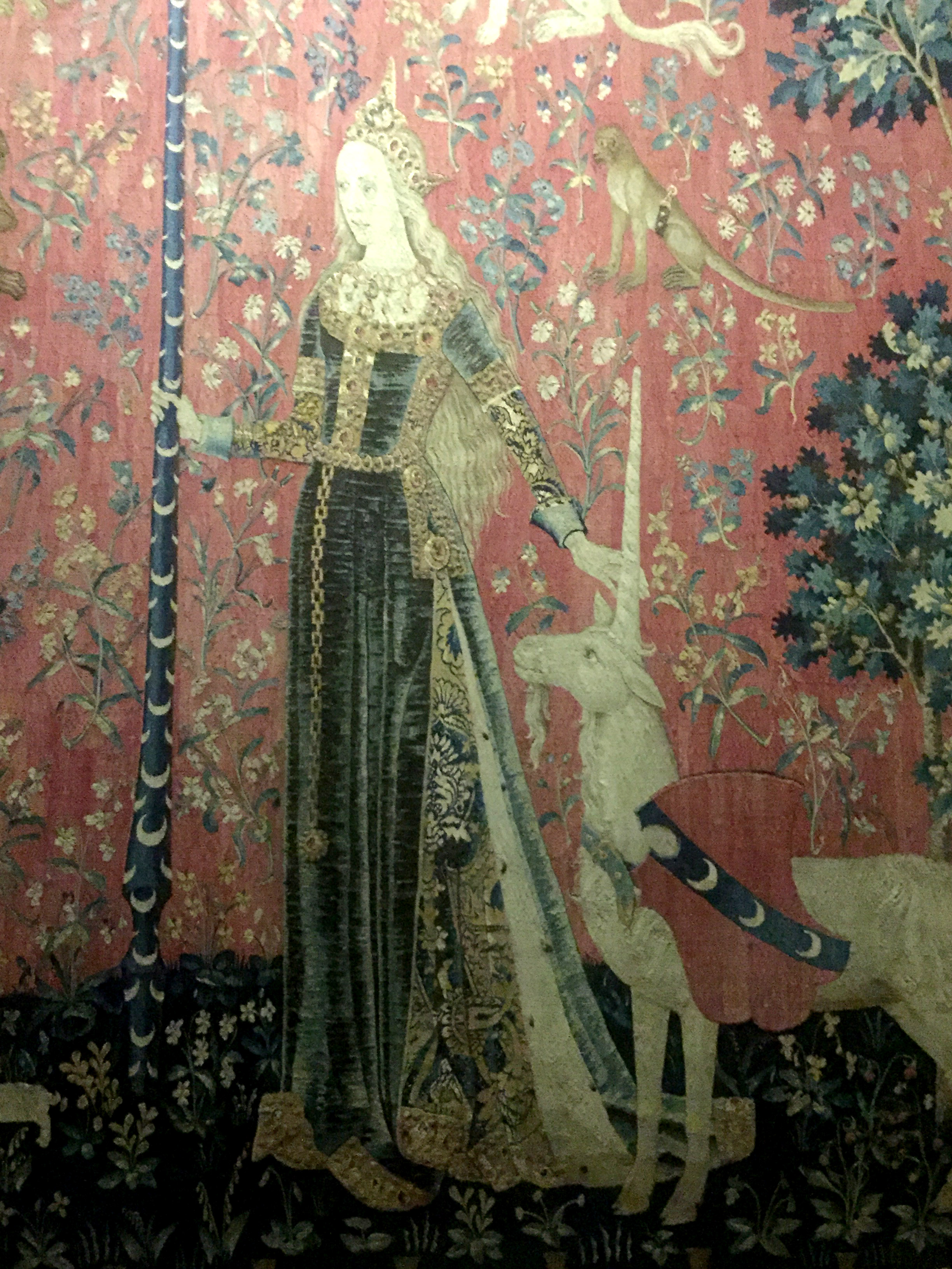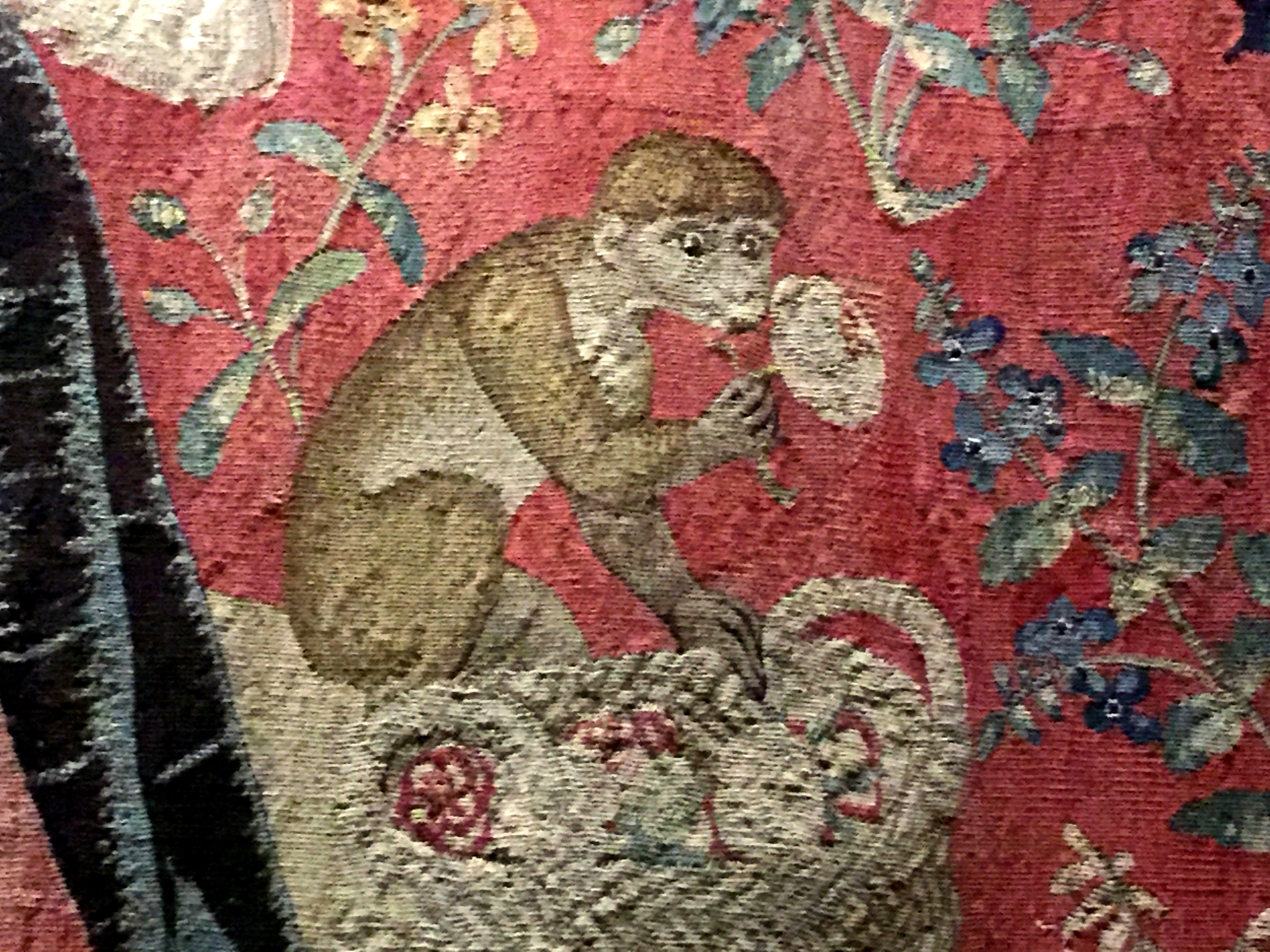 The tapestries depict the five senses: taste, touch, sight, sound, and smell. This one and the close ups are of Smell.