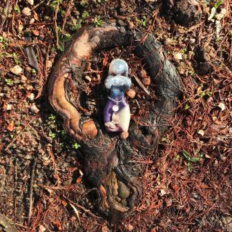 I sit in silence on a slab of back stone pitted with holes where we discover a warren of miniature chambers and caverns. It looks like a fortress or monolith, a series of squatting shapes, or Easter Island heads. But, piles of droppings within one bridge of stone reveal it is more likely the rats of Nimh who in here dwell. A thin and well-traveled trail leads across pine needles down the hill and to the puddled stones. Perhaps, we think, it is really gnomes who live here and the chamber is where they stable their noble, rodent steeds.