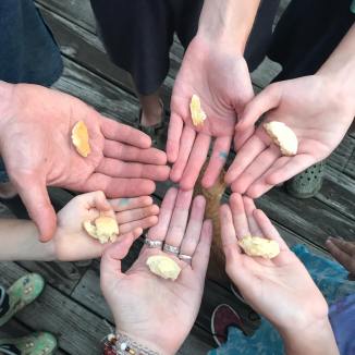 I have made four extra little biscuits, round and a bit lumpy, an offering for each of the four directions. I extend my hand into the center of our circle, cupping one small round biscuit at a time. My children and my husband extend