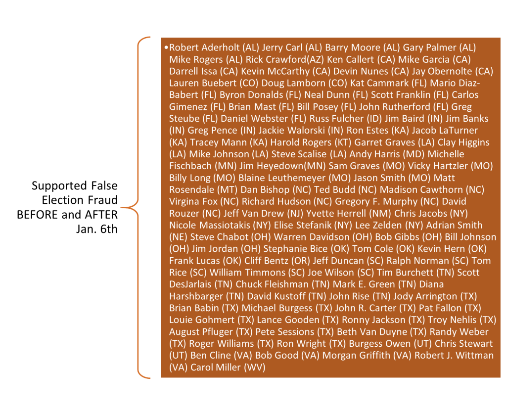 It was not just Trump who has blood on his hands, we also need to hold his politician supporters and foot soldiers as complicit participants in the events of January 6th. They need to be censored, removed from office, and indicted for sedition. Not only have these members of Congress perpetuated the ideas set forth by Trump that the 2020 election was rigged, inaccurate, and corrupted they also supported the multiple lawsuits against 6 different state’s elections and brought resolutions to the US Congress. Even after the Senators and Representatives emerged from sheltering in place, 157 members maintained their complicit actions of sedition, falsehood, and corruption.