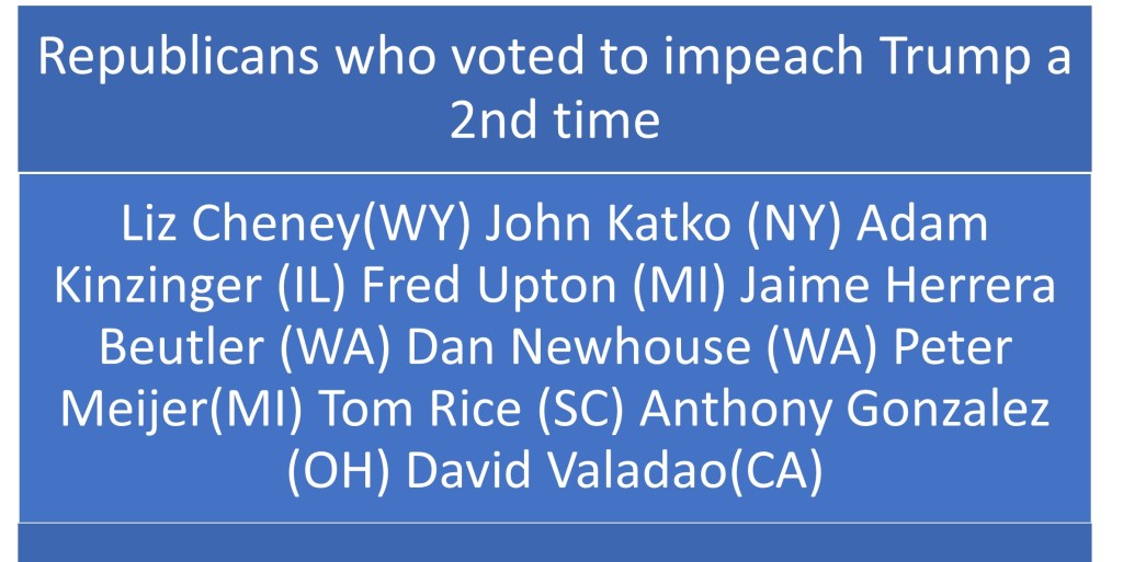 The Senate is now charged with decided to prosecute, remove, and/or bar from ever holding office again. 197 House of Representatives rejected their Congressional oaths by voting against impeaching Donald Trump. Below is the list of Republicans who voted in favor of the 2nd Impeachment.