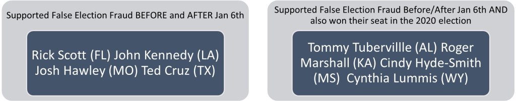 There were a few Senators who withdrew their support of rejecting of certain state’s elections, but 8 Senators maintained their treacherous positions. Here are the names of the Senators who have disregarded their Congressional Oaths and are complicit in the insurrection attempt of January 6th.
