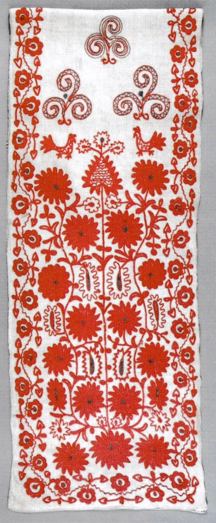 The red-on-white rushnyky shown here are typical of central Ukraine; each district has its own distinctive style. The embroidered patterns are outlined freehand in stem stitch, then filled in with a wide variety of different stitches. The same motif is mirrored at both ends. This embroidery technique is used exclusively for rushnyky, not for ‘secular’ textiles.