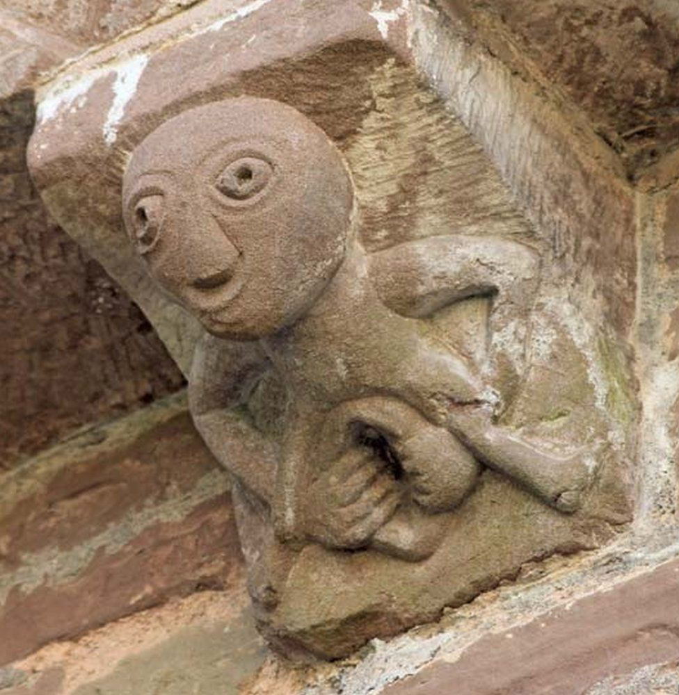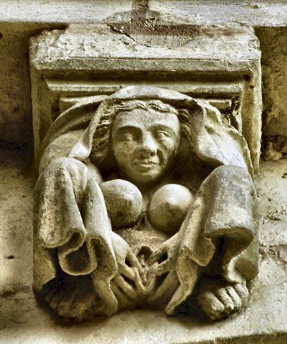 Whatever their origin, be it medieval or much older, the small female figures with bald heads and staring eyes still evoke a powerful response as they crouch, knees bent, arms akimbo, grasping a labial lip with each hand─ pulling them apart to reveal their gaping vulvas. Not the sort of thing one ascribes to ordinary Christian décor, and yet they appear in cathedrals, churches and chapels throughout western and central Europe.