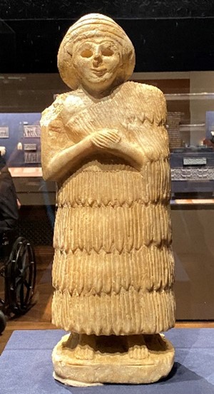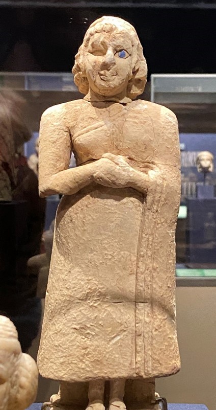 Ca 2400 BCE. Notice her elaborate dress. She once had inlaid eyes. This was found in a temple dedicated to the mother goddess, Nintu.