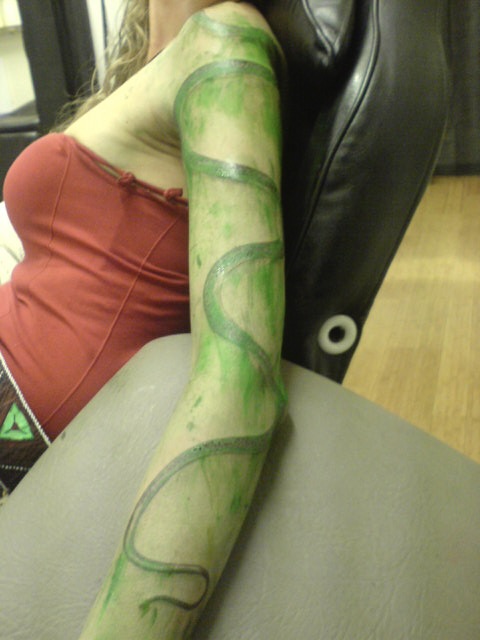 I lived in Glastonbury at the time, and one evening I walked past a tattoo parlour. After regretting having my ears pierced at age 8, I never contemplated other body alterations, so such shops never grabbed my attention. Imagine my surprise when, in my mind’s eye, I saw Green Snake jump into the centre of my archetypal constellation. The moment Snake arrived, Warrior and Wild Woman, Earth Mother and Priestess could relax in deep interconnection, knowing how integral they each were to my being. A week and many synchronicities later, Green Snake was tattooed on my left arm, where I see and kiss her every day.