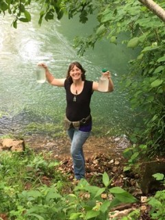 Then, ahead of us on the trail, after the cliffside, and where the path opens back up into grassy bottomland again, we finally see our friend. She is immersed to her waist in the icy water and in her hands, held to the sky, she holds our jar of sacred water.