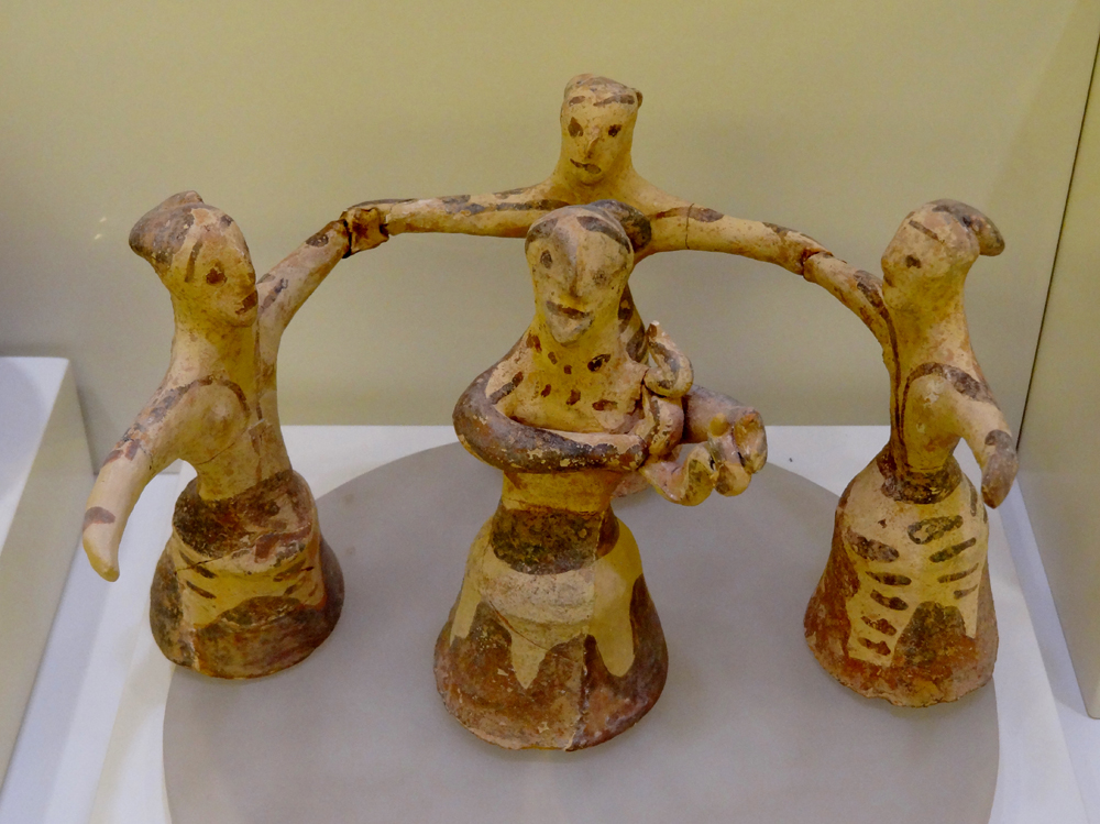 The first place we can observe this – and, for me, most significant – is the dance circle. Archaeological finds provide evidence of circle dance, for instance in this group of terracotta figures depicting women dancers and a female musician. Today, traditional dance and music continue to flourish as a vital part of people’s lives in an unbroken line from Neolithic and Bronze Age civilisations of Old Europe.