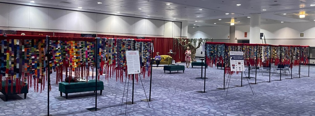 Imagine walking into a space surrounded by the woven stories of 1,000 women from around the globe and feeling you are at home. The Women’s Village at the Parliament of the World’s Religions conference in Chicago in August of 2023 offered a place where women could feel welcomed, safe, understood, honored, and inspired. It was surrounded by the color and texture of the Women’s Woven Voices project tapestry.