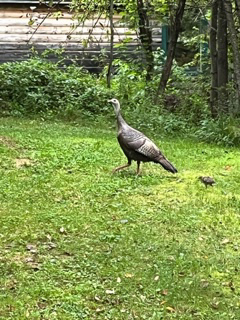 One turkey hen also nests here, but unlike the grouse mama turkey will proudly parade her young up the hill, settle into the moss and spread out her wings in the sun. Last year mama’s single chick was nestled under her wing.