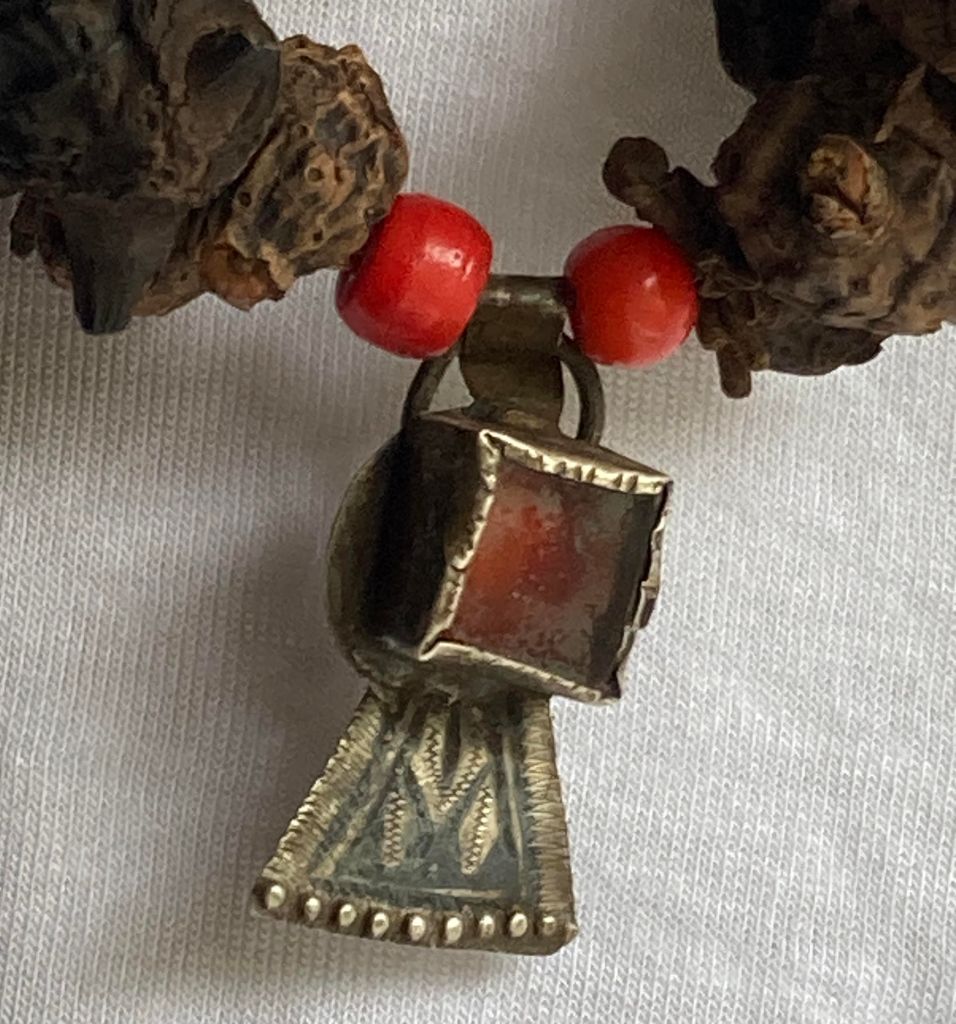 When I bought it, the central silver pendant was completely black with grime, but a little cleaning revealed incised motifs combining the yoni, the double-peaked mountain Goddess, and the azemmur or olive tree, Amazigh symbol of quiet strength and tazmat, life force.