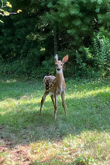As I watch the doe and her fawn eating apples on this deliciously cool and fragrant morning, I am also watching a gathering of shadows. The mid -August sun is sitting lower on the horizon streaming filaments of gold through the trees. Lime and chartreuse, slivery maples, a crimson tipped oak leaf all seem to catch my eye at the same time. The emerald mosses that line the book astonish me with their sinewy serpentine beauty.