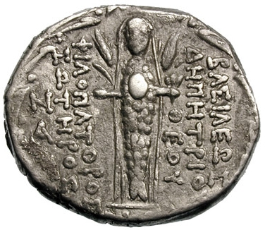 Silver coin of King Demetrius III of Syria with picture of the Derketo of Askalon