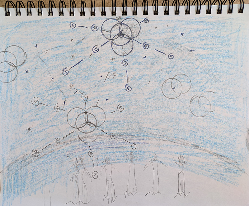 Having just completed a four-week thematic journaling prompts document, journaling was fresh on my mind. While revisiting some of my sketch pads and journals from my years as an artist, I discovered a sketch that inspired visions of bright skies and sacred geometry. This sketch intertwined with my reflections on Imbolc, leading to the creation of Awakening to the Light, the painting seen above.
