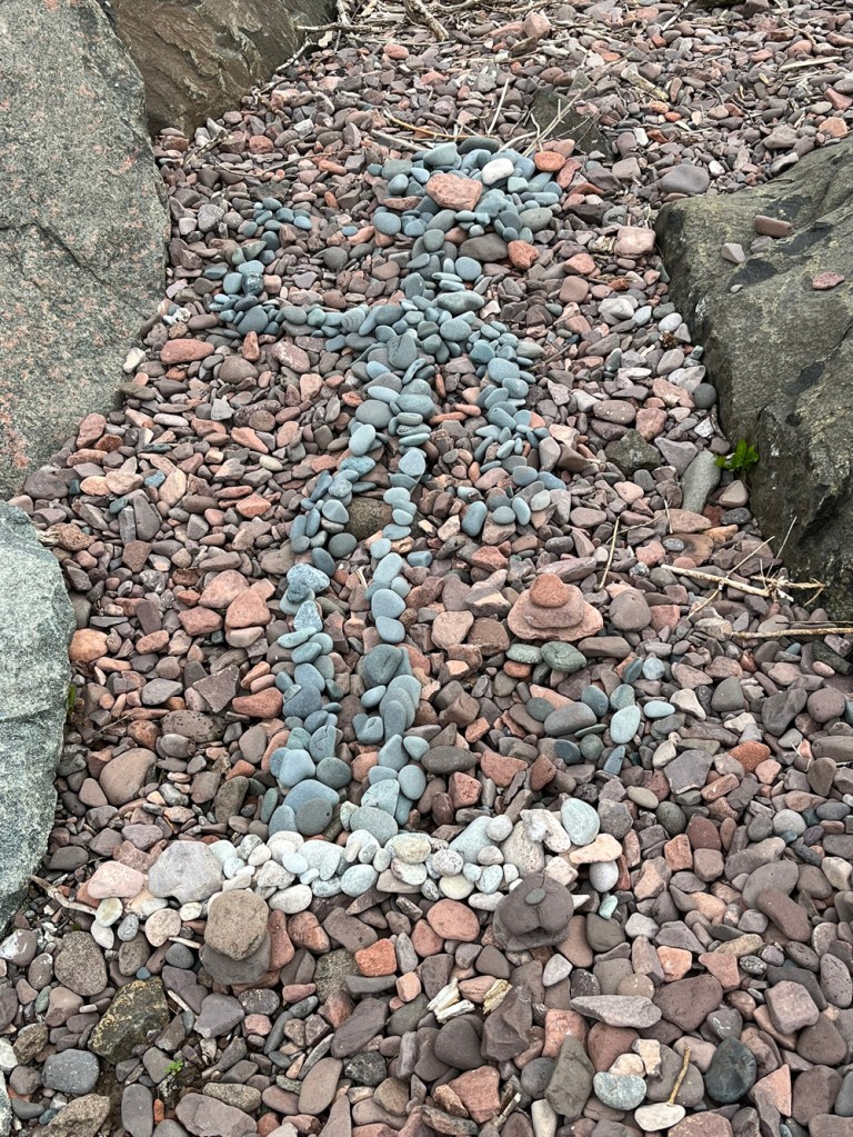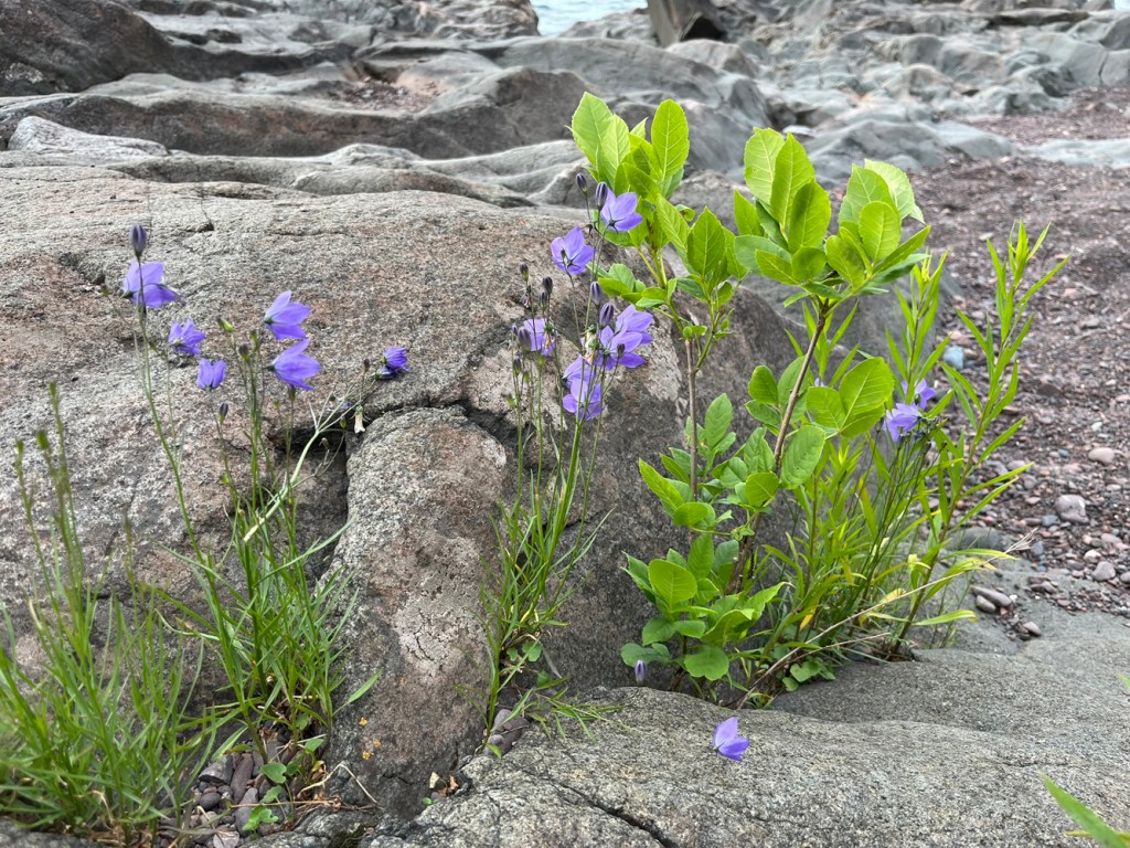 Perhaps that is what I was seeking when I went to the lake this morning. It was cool and gray, the lake and sky reflecting the clouds of dismay that filled my being, but it was just the mood and temper of the lake that I needed, granting me the quiet and solitude so curative for the turbulence in my soul. Gichigami, as it is called by the Anishinaabe, holds a wisdom in its vastness; the ancient rocks that line its shore carry the solidity and perspective of eons of time. Sitting on those rocks, with the quiet companionship of my dog, Ben, I let the healing spirit of the waves wash over me. As I felt my spirit be restored, I began to notice signs of resilience all around me – the wild parsnip, yarrow, and blue harebells growing through the slightest cracks in the rocks. Even here on rocks two billion years old, new life; amidst the dark gray, flowers bursting with color – yellow, white, purple, blue, green; evidence that even the most solid of boulders have their cracks where life can take root and flourish.