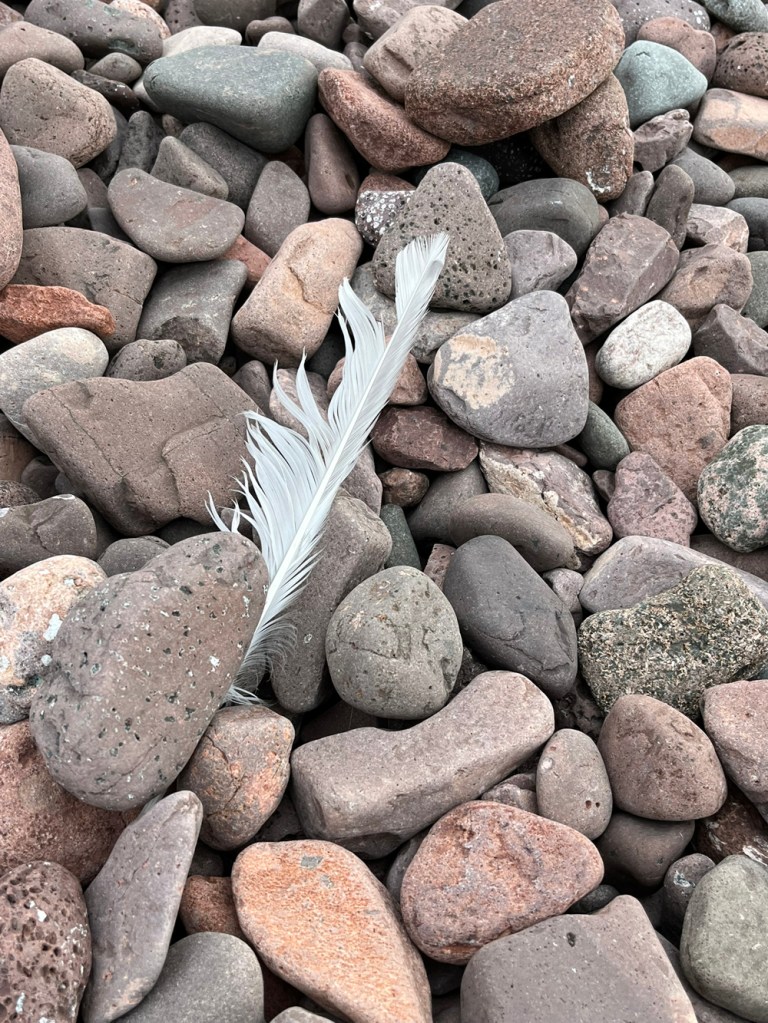 Walking farther along the shore, the many rocks surrounding me formed from lava pouring from the volcanic activity that once erupted here were lessons in and of themselves of how periods of volatility can evolve over time into places of peace and serenity. Later, a white feather I found in the rocks brought Emily Dickinson’s poem, “hope is the thing with feathers,” to mind — a talisman of sorts to restore the light of hope into the day.