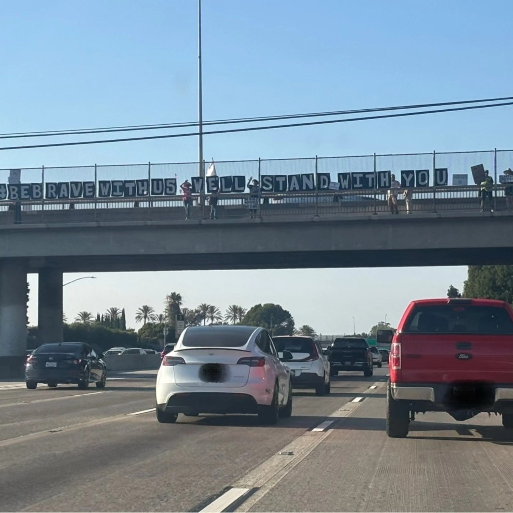 Photo of Indivisible Lakewood, banner drop action August 2025, “Be Brave With Us” by Heather Rodriguez
