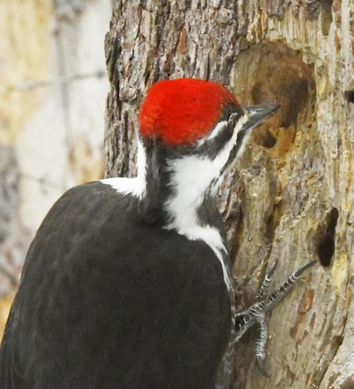 At first, I enjoyed woodpecker presence and their antics but during the last week I have found the escalating chirps disturbing.  Some days especially around 4 PM a pileated woodpecker joins the other three; this one is drilling a hole in the side of the cabin.