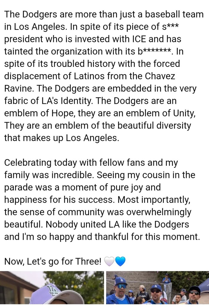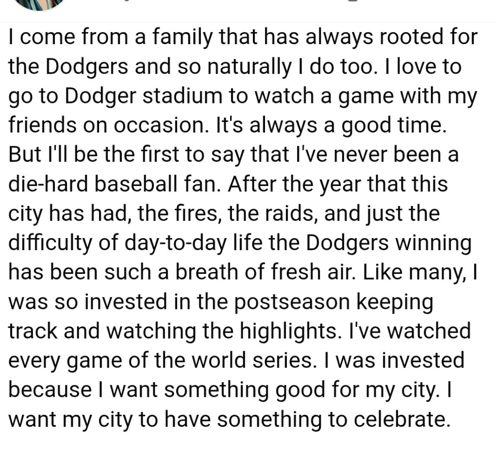 And yet, the tension continues. Currently there is a petition urging the Dodgers to skip the invitation to attend the celebratory White House visit (traditional after winning the World Series) due to the administration’s targeting of Latinx communities with their violent, indiscriminate ICE raids. There are also direct ties between the Dodger co-owner, Mark Walter, and “a private prison corporation that operates U.S. Immigration and Customs Enforcement (ICE) detention centers.” The same team that brings so many people together in community, that inspires pride and a sense of unity and joy, is part of a corporate franchise that profits from its violent oppression.