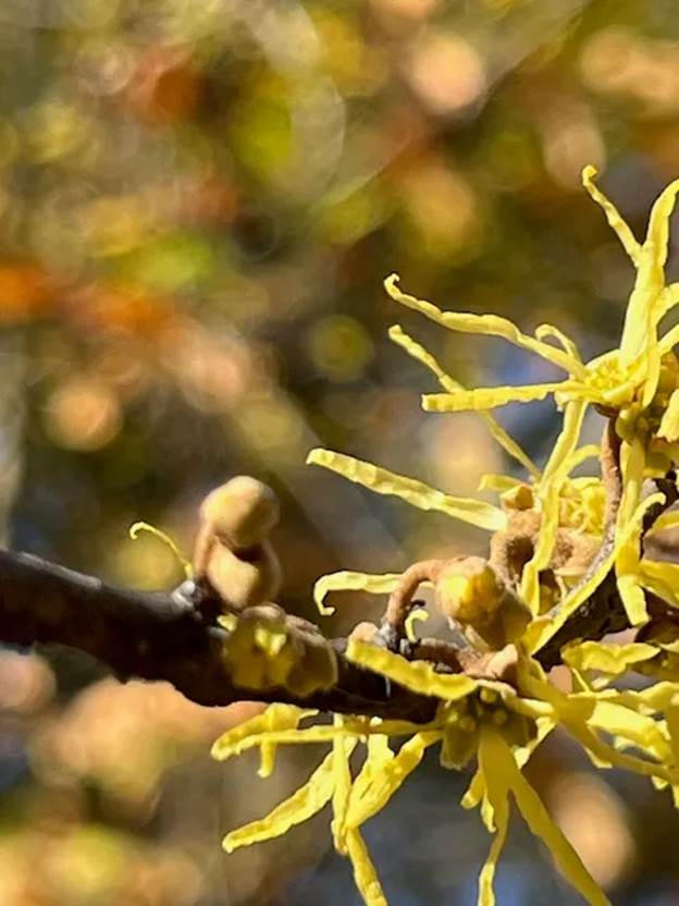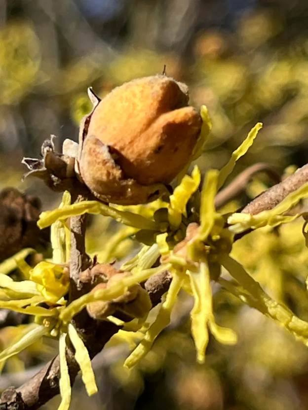 Like all flowering plants, witch hazel must be pollinated to produce fruit and seeds, and for this, it relies on insects. These include late-flying gnats and flies as well as forest-dwelling owlet moths, all drawn to the scented flowers and sweet nectar. On warm days like the few we have had this week while surrounded by an annoying cloud, I hoped these flying gnats were also busy pollinating lemony witch hazel ribbons.
