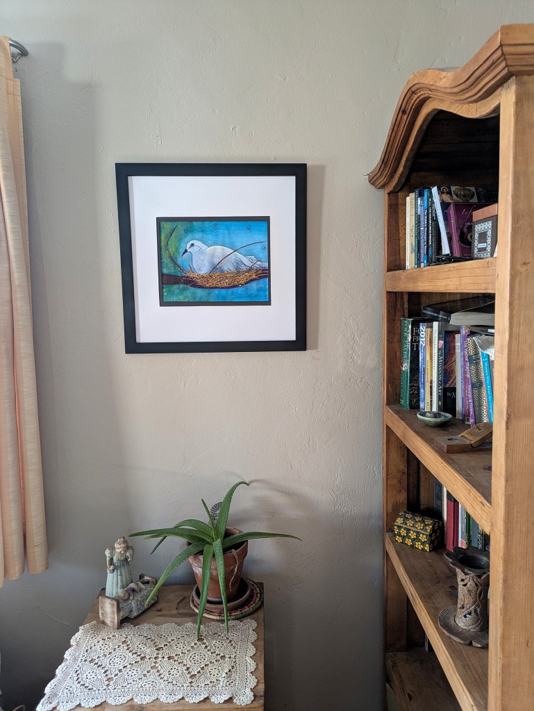 I spent a long time working with Mama Dove, adapting it to the old frame. Then, I cleared a spot to hang it, photographed it in its new place, and took detail shots for my new online gallery, Singulart. Thoughts about Dove swirled in my restless brain throughout these activities, inspiring me to explore the symbology and stories of Dove further.