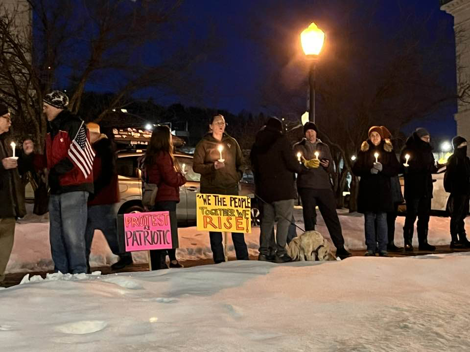 The scene as I drove to the protest and vigil against yet another of the government’s actions and agents was a bit surreal. Juxtaposed against the violence and state repression lay the backdrop of a strikingly beautiful sunset, the sky streaked with pink and purple, peach and blue, and then ahead of me as I passed the hospital, in glowing neon red, the words ”EMERGENCY/TRAUMA.” Yes. We are facing an emergency in this country and trauma of epic proportions. Violence and beauty, rage and tenderness – both. Among the fellow vigilers — friends, former students, long-time comrades in the struggle. We hugged and cried, lit candles, shared our hopes, our fears, our sorrows. Together in this moment we found community in each other.