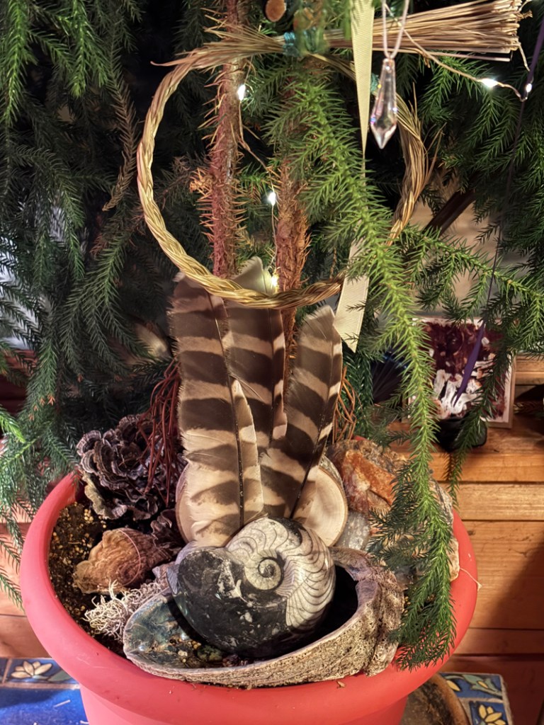 After heartrending dismemberment, I placed three feathers on a shell under my indoor ‘tree of life’ (Norfolk pine). Instead of turning my star -lights off I left them on and although they are fading four days later as batteries lose power that tree continues to bear witness for this owl, and the senseless killing of barred owls occurring across the country. Unimaginable grief. The only awareness I held in the beginning was that I was repeating an old behavior with another dead owl after a thirty-five-year break.