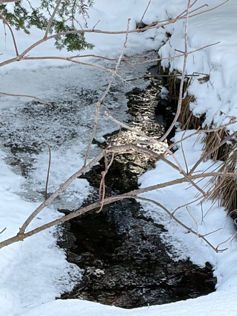 It’s getting late, long shadows are reflected on sparkling snow and shimmer over the seep. I am not sure why I am so drawn to these openings in the earth’s crust beyond the obvious – to look for tracks. There is something about these open waters when every living thing is encased in snow or ice that calls to me insistently. I tell the seep that I will be listening, and maybe when the time is right, I’ll learn more. We’ll be back I say.I take a moment to thank the forest before we reach the car reluctant to head home.