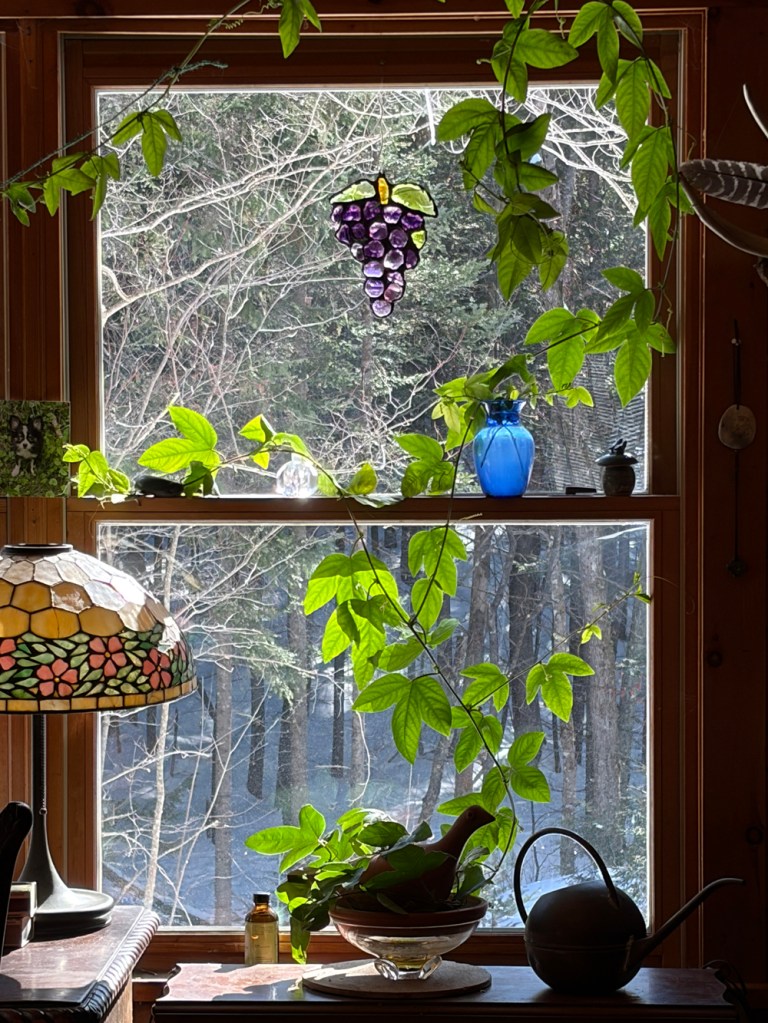 During the winter instead of fading the passionflower flourished climbing towards the ceiling creating a circular pattern with ki’s tendrils that embraces some purple grapes that sparkle and shimmer in emerald green and ecclesiastical purple when the sun strikes them each morning. Grapes that vaguely remind me of the Jesus story of being the vine. I may have left Christianity behind, but this religion still lives in me through doves, grapes and passionflowers. Although I may not be happy about this association I have come to accept it as part of my heritage. Jesus was crucified in the spring, and every year I come around on this story with trepidation in my heart. Betrayal is one of my roots. I may not choose it, but I am aware that it is best to acknowledge it with all that entails. I turn to the story that being written by the dove and passionflower who is circling questioning what message this plant might be conveying.