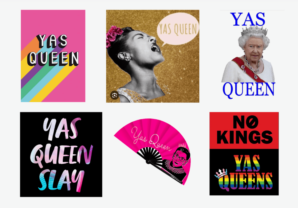 The Queen archetype has deeply empowered marginalized communities. Originally used to mock gay men or those who did not conform to traditional masculinity, the word Queen was reclaimed as a powerful symbol of solidarity and self-acceptance by LGBTQ+. The popular (and highly merchandised) phrase “Yas Queen” is now a galvanizing term for anyone who “slays” (embodies their fabulousness).