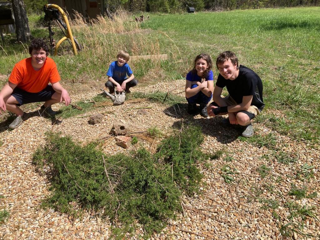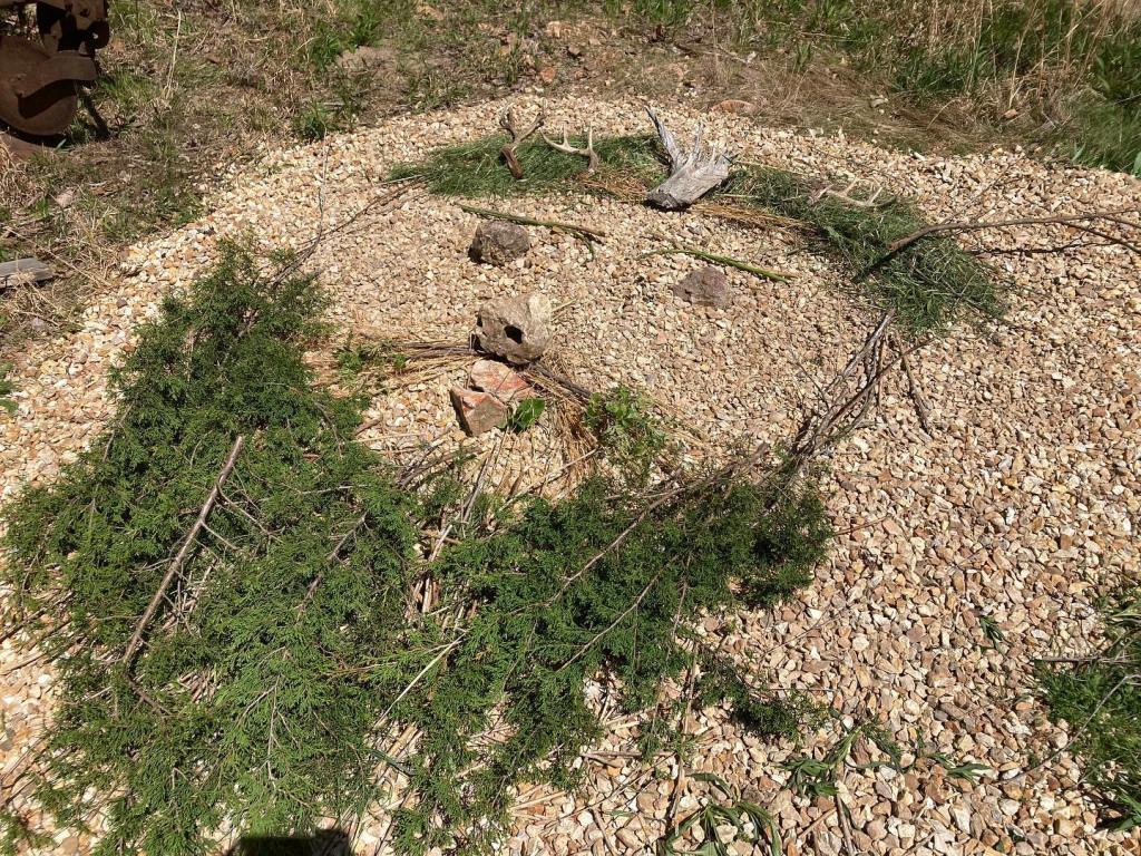 This year, May Day was bright and sunny with a wild wind. We circled near the driveway, building our Man on the gravel, where his features would stand out against the brown rocks. We gave him antlers formed from cedar branch and white-tailed deer and a crown of a split stump of gray oak. My oldest son trimmed off cedar branches for his beard, my husband pruned the hydrangeas of last year’s dead growth to frame his face, my sixteen year old gathered golden stalks of dry bluestem grass for a mustache, and my 11 and 7 year olds gathered pieces of grass and cinquefoil to trim his hair and beard.