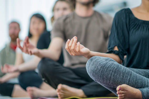 A multi-ethnic group of young adults are indoors in a fitness center. They are wearing casual clothing. They are meditating while sitting on the floor in this angled shot.