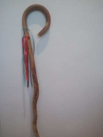 One of the symptoms of my chemotherapy is neurasthenia or partial numbness in my right foot. When it first occurred, I fell three times in my apartment because I was not lifting my foot automatically. I became afraid to move without holding onto the walls or furniture. I resisted my friends’ advice to get a walker, but finally agreed that I needed some form of physical support. I arranged for my friend Eirini Kouraki to have a rubber tip added to the shepherd’s cane I sometimes use walking in the mountains. When she brought it too me, I decorated it with three ribbons I saved from rituals at the Holy Myrtle Tree at the Paliani monastery in Crete. The most recent were brown, the color of the earth, and red, the strong energy I will need to heal. I added a light green-blue ribbon, representing the calm and clear optimism I feel as I face a crisis of life and death. The ribbons remind me of the healing power of the Holy Tree that I have called upon many times, turning a symbol of my infirmity into a symbol of healing and hope.