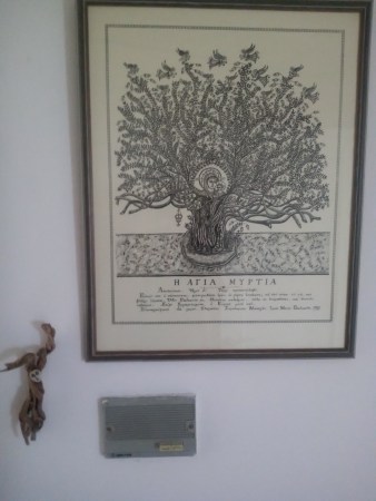 In the hallway I placed a copy of a drawing of the Holy Myrtle Tree of the monastery of Paliani created by one of the nuns. According to the story told, the area where the monastery was later built was burned in a fire but a small myrtle bush survived. It was watered by girls who saw the image of the Panagia (Mary the Mother of Jesus) in its charred branches. So, the monastery which was known as ancient in 668 CE was built. The monastery is a sacred place for the surrounding villages. The sacred tree and the icon of the Panagia in the church are said to have performed many miracles. Below the drawing of the Sacred Myrle Tree is a small image of a face in a twig from tree given to me by German artist Carla Randel.