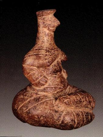 The strange and cheerful figure portrayed in this ancient Cretan vessel comes from the site known as Fournou Korifi near Myrtos, in Crete. Dated before 2000 BCE, she was called the “Goddess of Myrtos” by the excavator, Peter Warren. This little Goddess was found on an altar in a small room in the ritual area of a complex of small rooms on a hill above the sea that was home to up to 120 people. The Goddess of Myrtos is a vessel holding a vessel. In ritual libations, liquid would have been poured from the pitcher she holds onto an altar.