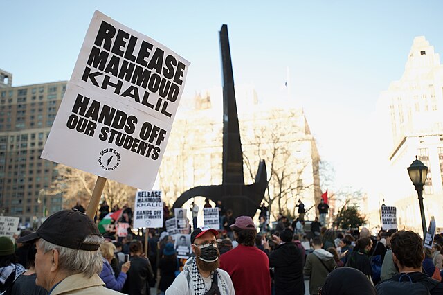 Wikimedia Commons: Protests in Thomas Paine Park against the detention of Palestinian activist and Columbia student Mahmoud Khalil. [SWinxy]