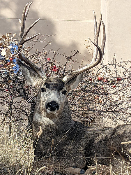 The racks found on bucks from other deer species during the fall rut are also impressive. I was lucky to see many mule deer during my Thanksgiving stay in the Jemez Mountains of New Mexico. Deer who wander into town are protected and thus not afraid of humans. This allowed me to get very close to this magnificent buck and capture his photo. He was not at all interested in looking at me so it took awhile to get this shot from just a few feet away.