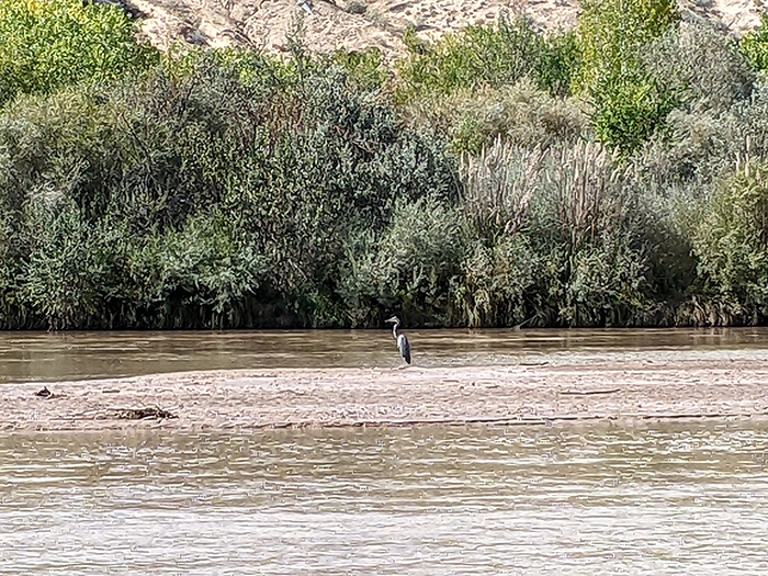 Shortly I noticed a lone bird, standing tall on a small island in the far side of the river It stood and it stood – same position – same spot. It was tall like a crane – many are arriving now. But no, something was different – it wasn’t a crane. It was grayer with fringe-edged feathers around its neck. With the help of my phone camera I discovered it was a Great Blue Heron. I was amazed!