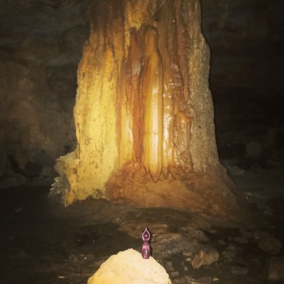 We walk along the nearly vertical hillside hanging onto small trees for support. Finally, though we almost miss it, we spy the opening to the cave nestled behind several mossy stones. The sun is still on the rise above the tree line and the rays filter through the trees so one ray is pointing directly at the cave entrance. We crawl inside, bumping our heads and scraping our backs as we wiggle into this womb in the earth. Once inside, the chamber enlarges so we can stand up. Unlike other caves we have experienced in this area, the only human signs we find are a single bottle cap, a glass bottle, and two sets of initials carved into a rock. In the dark silence we hear the sound of water dripping steadily. I make my way further into the cave, acutely aware that this is living cave and being careful not to step on the fresh, wet, cervix-shaped beginnings of new stalagmites on the floor. At the back of the cave, I find her. A Madonna-like stone column, glistening with water. In the silence of the cave, I quietly sing Ancient Mother to her, as tears well in my own eyes.